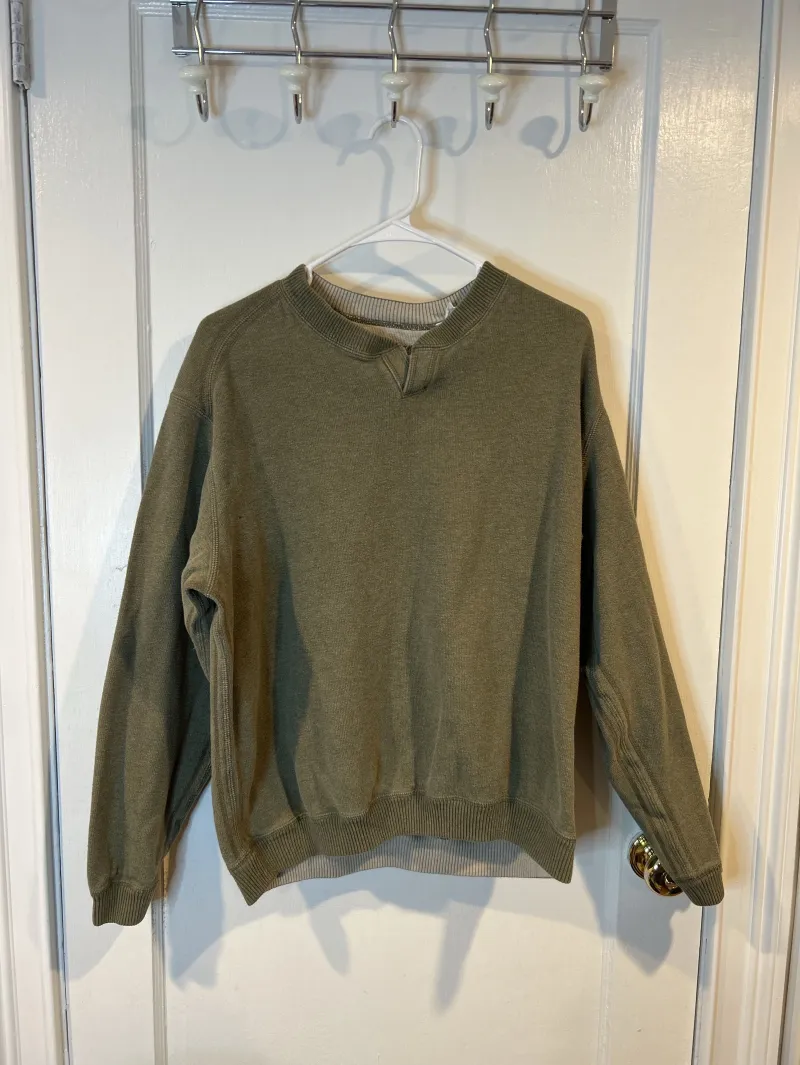 Solid everyday Tommy Bahama sweater in olive green, men’s size Large. Long sleeves, no pockets, clean simple look. Perfect for fall and winter layering. Worn a good amount but still in good overall condition. Tag is shriveled/damaged from the dryer (doesn’t affect wear at all). Red seam detail on the shoulder gives it a unique touch. No rips, no stains, no smells. I just don’t need it anymore. Local pickup in Hawthorne, NJ. First come, first serve.