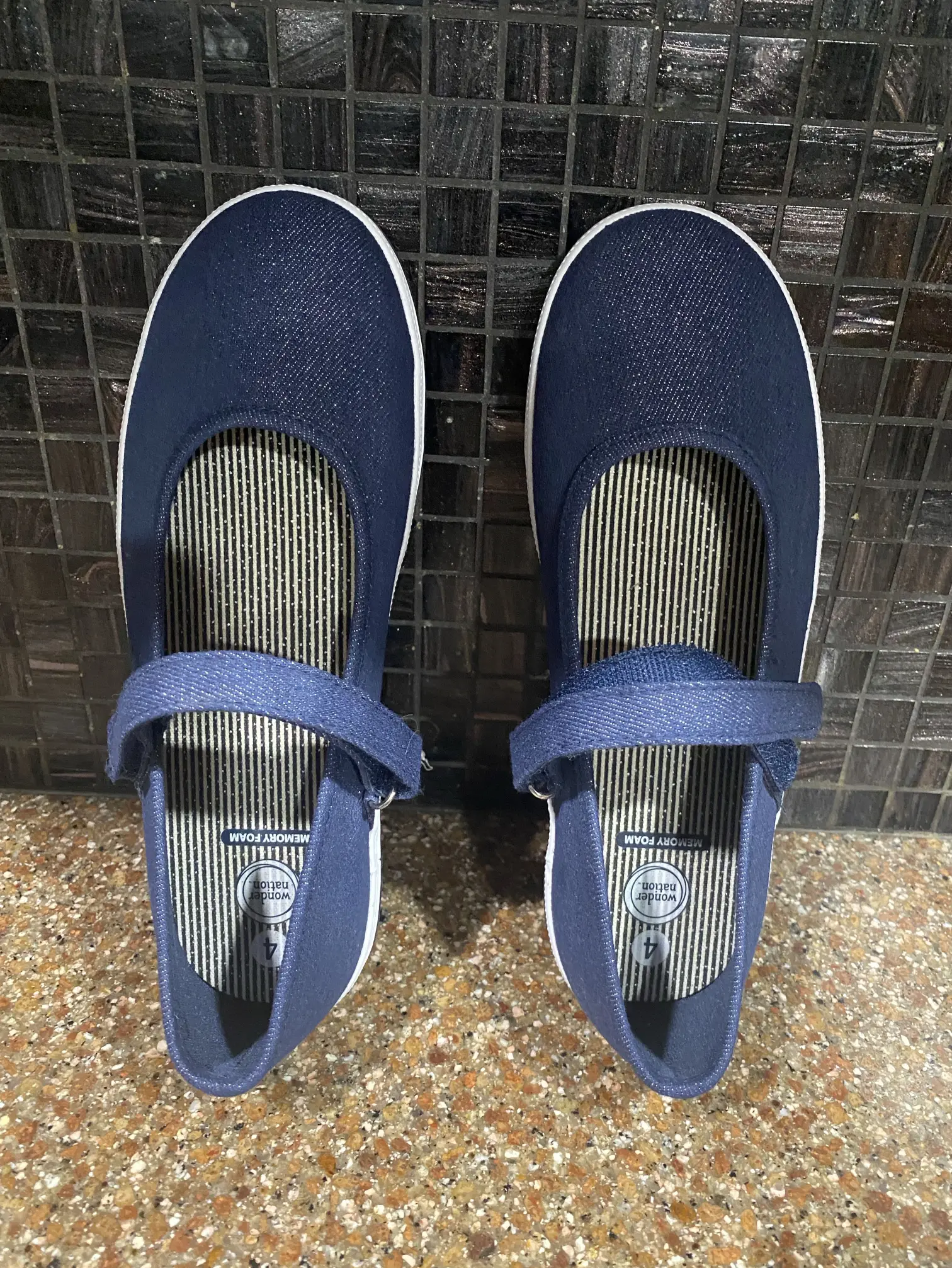 Size 4, navy blue with strap. Brand new never used