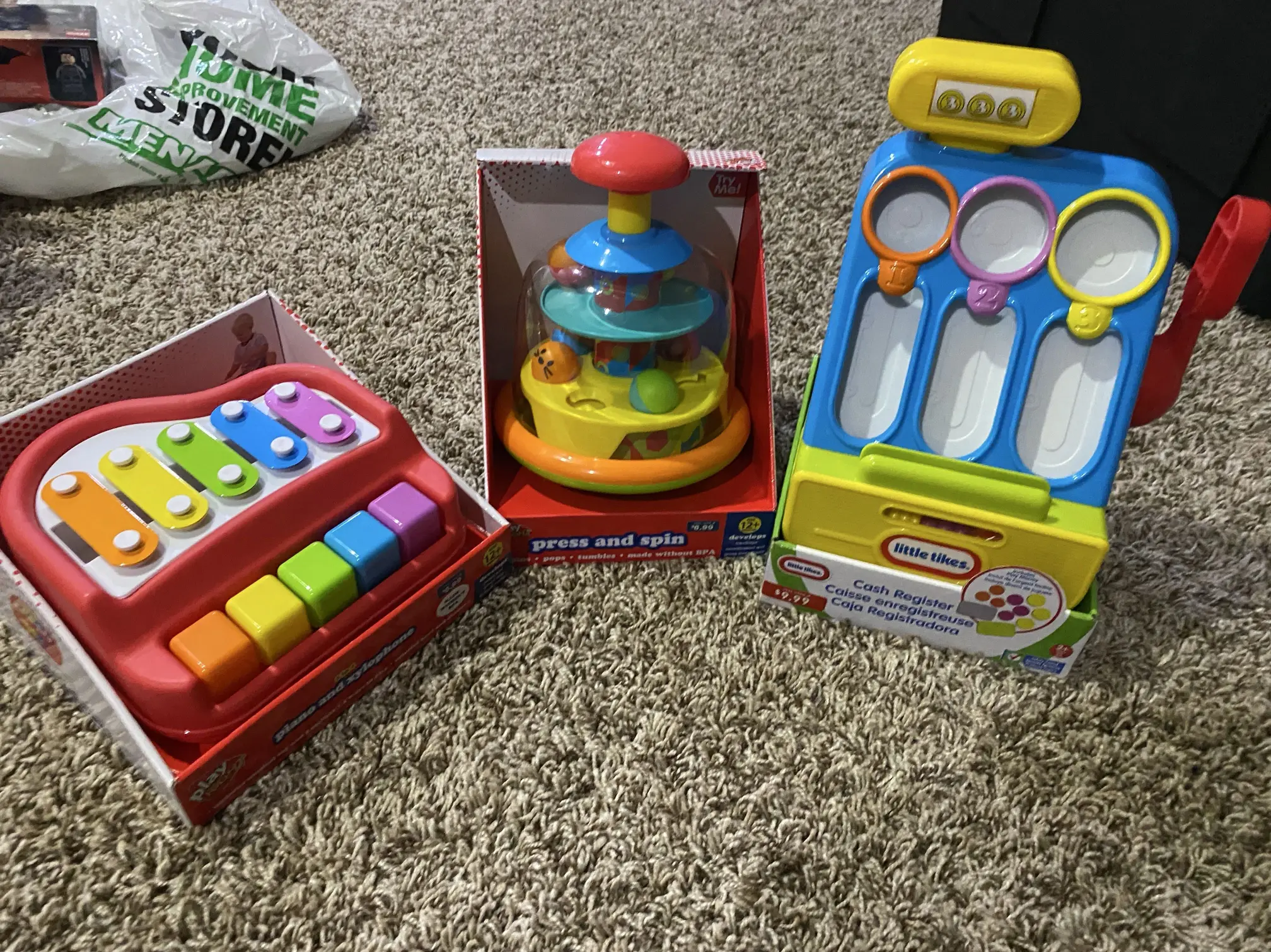 Brand New, $3 each. Includes a xylophone, press and spin toy, and Little Tikes cash register.