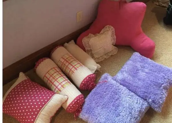 Large pink study pillow $20 3 pink polka dot pillows $20 2 cream lace pillows $10 Text 907-202-1422