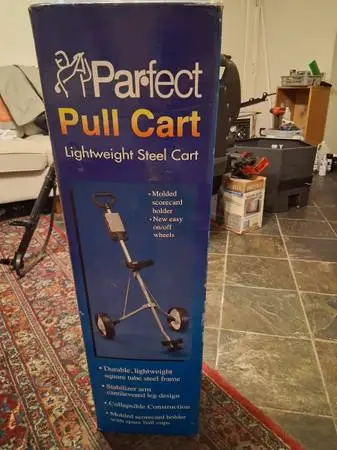 ⭐️GOLF PULL CART - PAR -FECT BRAND LIGHTWEIGHT STEEL⭐️ BRAND NEW IN BOX. NEVER BEEN USED OOR EVEN TAKEN OUT OF BOX. MINT CONDITION. EBAY IS CHEAPEST & IS SELING FOR $80 + $25 SHIPPING. MY PRICE $20 PLEASE CALL/TEXT WILLIAM AT EIGHT32.754.5441