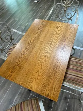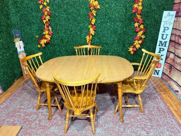 I can deliver this at no extra chargerain or shine with a cargo vanif you live within 25 miles or so of Centerville Ohio. Feel free to pay when I arrive. I take most forms of payment. Call or text for details 937-269-3354 This table and 4 chairs comes with 3 leaves, and it is in good shape. The leaves are 12 inches wide each. with no leaves in, it measures 58 inches long, 42 inches wide and 30 inches tall..