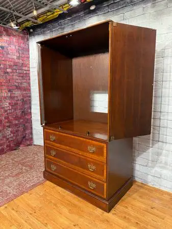 I can deliver this for no extra chargerain or shine with a cargo vanif you live within 25 miles or so of Centerville Ohio. Feel free to pay when I arrive. I take most forms of payment. Call or text for details 937-269-3354 This armoire / TV cabinet is in great shape and has lots of storage. All the drawers work as they should. It measures 42 inches wide, 24 inches from the back to the front and 72 inches tall.