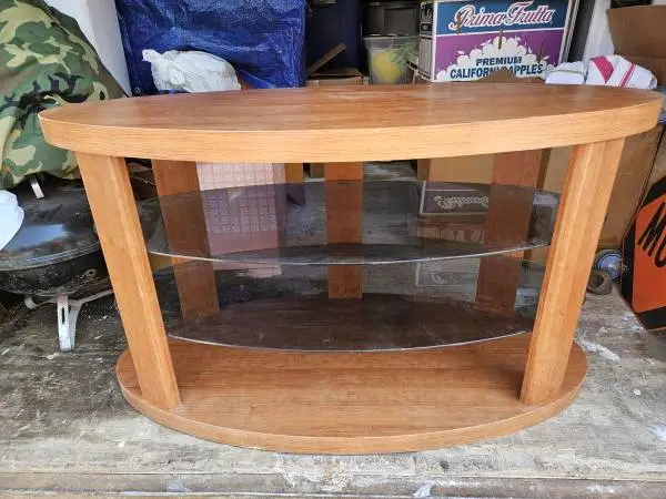 Oval TV Stand with 2 glass shelves, could easily be used as a Library table also, 45 wide x 26 tall x 21 deep. Good Condition overall. $50. Text Only Kevin 406-880-0480
