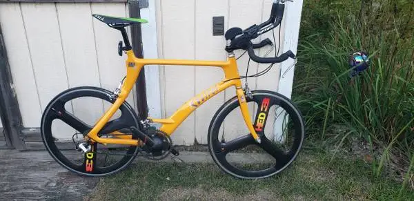 Excellent condition triathlon /racing bike. Has a 59 cm carbon fiber frame. 650 c HED 3 carbon wheels. Shimano Dura Ace shifters, derailleurs and brakes. Carbon Zipp Speed Weaponry double crankset. Suntace tri bars with new pads. New Tufo tubular tires. New stainless steel cables. Comes with WheelSafe and 3 addditional 650 c wheels. 2 alloy wheels for training and 1 racing rear wheel. $2500.00 Firm .Cash only Call or text 269-363-1628. To see my other available refurbished bikes ,click on the more ads by this user