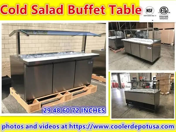 Refrigerator Cold Salad table Buffet Table Sauces station sauce caddies 🔥 BRAND NEW UNIT AVAILABLE! 🔥 INTERESTED IN THIS UNIT? 📞 CALL or TEXT NOW!! ➡️ REBECCA:305-440-9317 🗣️ Hablo Español ⚠️ Prices are subject to change — Please call to confirm! SHOP NOW WITH COOLERDEPOT Why buy used when you can buy new for the same low price! </b> Brand New In The Box Item Number:s 70 $990 No Glass Cover Item Number:Sc 71 $1790 Including Glass Cover l 71 In*w 32 In*h 50 In 10 Plate Item Number:Sc 60 $1690 Including Glass Cover l 60 In*w 32 In*h 50 In 8 Plate Item Number:Sc 48 $1590 Including Glass Cover l 48 In*w 32 In*h 50 In 6 Plate NSF ETL COLD TABLE Item Number:ScL 27 $2251 Including Glass Cover L 27 In*w 34 In*h 55 In 12 Plate Item Number:ScL 48 $2501 Including Glass Cover L 48 In*w 35 In*h 55 In 18 Plate Item Number:ScL 60 $2835 Including Glass Cover L 60 In*w 34 In*h 55 In 24 Plate Item Number:ScL 72 $3035 Including Glass Cover L 72 In*w 34 In*h 55 In 30 Plate Specs: - Model: s 70 - Stainless Steel 2 Door r, 2 Shelves, - Lock Fitted With Door Locks - Digital Display - Capacity: 46 Cubic Feet. - Adjustable 35 to 41 f Temperature, Electro-Mechanical Thermostat - 1 Compressor 1/2 hpFor Improved Efficiencies, - Ergonomic Design, Recessed Door Handles. - Refrigerant: r 134 a, Power Requirements: 5.6 Amps @ 110-120 v AcRegular 3 Prong Outlet - Dimensions: l 71 In*w 32 In*h 32 In - Warranty: 2 Year Compressor Warranty Included. 1 Year All Additional Parts. More item 123 Tap Beer Dispenser Kegerator Commercial Brew Fridge Cooler 2 Automatic Electric Sealing Machine Cup Sealer Boba Bubble Tea Coffee 3 Chinese Wok Range Nsf Csa Natural Gas Commercial Restaurant 4 Refrigerator Bakery Deli Pastry Case Display Showcase countertop 5 Electric Deep Fryer Broiler Griddle 6 Meat Case Fish Cabinet Seafood Freezer Display 7 Beer Cooler Commercial Freezer Refrigerator Refrigerated 8 Barstool High Chair Table Cafe Coffee Shop Bar Stool 9 Freezer Refrigerator Glass Door Beer Cooler 10 Glass Door Beer Cooler Beverage Flower Refrigerator 11 Led Light Boxes New Menu Billboard Menu Board Led Sign 12 Dough Sheeter Pizza Roller Pasta Maker Noodle Machine 13 Stainless Steel Outdoor Outside Table Tables Chair Chairs 14 Ice-Sucker Popsicle Mold Pop Machine Maker Popsicle Freezer Case Display Ice Bar Ice Lolly Icicle 15 Commercial Reach In Freezer Refrigerator 16 Commercial Professional Panini Press Grill And Sandwich Griddle 17 Standing Meat Saw Cutter Grinder Sausage Stuffer Maker 1.Tags: Restaurant Equipment, Bar Equipment, Taqueria Equipment, Deli & Coffee Shop, Ovens, Convection Ovens, Donut Equipment, Pizzeria Equipment, Closing Restaurant Equipment, Grill, Grills, Buffet Equipment, Fridges, Freezers, Coolers, Warmers, Chests, Restaurant Tables, Restaurant Chairs, Benches, Restaurant Dishes, Fryers, Double Fryers, Dry Boards, Stainless Steal, Sinks, Display Cases, Ice Makers, Warming Displays, Refrigerated Displays, Display Racks, Cautionary Equipment, Janitorial Equipment, Light Fixtures, Plates, Booths, Salad Bar, Bar Tables, Small Tables, Heavy Equipment Tables, Heavy Equipment, Commercial Equipment, For Sale, Buy To Sell, Old Or New, Used, Mixer, Oven, Ice Machine, Booth, Chair, Sink, Vent Hood, Walk-In, Cooler, Refrigerator, Freezer, Bar Equipment, Fryer, Glazer Dough Divider, Bakery Equipment, Pizza Oven, Dishwasher, Stainless Steel Table, Mini Rack, Oven, Ice Cream Machine, Meat Slicer, Margarita Machine 2. Search: Stainless Steel, Glass Door, Restaurant Equipment, Commercial Equipment, Refrigerators, Freezers, Beverage Coolers, Merchandisers, Salad Prep Table, Under Counter Salad Prep Tables, Sandwich Prep Tables, Pizza Tables, Pizza Ovens, 1 Door Freezer, 1 Door Refrigerator, 1 Door Under Counter Refrigerator, 2 Door Refrigerator, 2 Door Freezer, 3 Door Freezer, 3 Door Refrigerator, Under Counter Freezer, Under Counter Refrigerator, Hinge Merchandiser, Slider Merchandiser, Back Bar Refrigeration, Bottle Cooler, Thunderbird, Bakers Pride, Atosa, True, Metalfrio, Hobart, Migali, Maxx Cold, Ice Machine, Ice Machines, Restaurant Freezer, Restaurant Refrigerator, Restaurant, Restaurant Under Counter Prep Table, Sandwich Prep Table, Upright Refrigerator, Upright Reach-In Refrigerator 3. We Are Your Source For: Italian Restaurant Supplies * Mexican Restaurant Supplies * Greek Restaurant Supplies * Brazilian Restaurant Supplies * Iranian Restaurant Supplies * Chinese Restaurant Supplies * Restaurant Supplies * Catering Supplies * Bar Supplies * Concession Equipment * Restaurant Equipment * Commercial Equipment * Concession Equipment * Ice Machines * Autocad Design * Refrigeration * Cooking Equipment * Restaurant Furniture * Restaurant Dinnerware * True Refrigeration * Janitorial Supplies * Kitchen Equipment * Restaurant Vent Hood * Restaurant Furniture * Ice Machines * Bar Supplies * Catering Supplies * Bar Stools * Under-Counter Ice Machines * Bar Blenders * Chafers * Wood Bar Stools * Modular Ice Machines * Beer Dispensers * Insulated Carriers * Leather & Vinyl Bar Stools * Restaurant Booths * Restaurant Seating * Fabric Booths * Countertop Ice Machines * Bottle Box Coolers * Ice Sculpture Molds * Metal Bar Stools * Ice Machine Filters * Glass Chillers * Pizza Delivery Bags * Patio Chairs * Ice Dispensers * Bartender Supplies * Chafer Fuel * Metal Chairs * Manitowoc Ice Machines * Bar Equipment * Folding Tables * High Chairs * Scotsman Ice Machines * Shot Glasses * Portable Bars * Dining Room Supplies * Kitchen Supplies * Ranges * Coffee Makers * Worktables * Funnel Cake * Ovens * Waiter Supplies * Hotel Pans * Waffle Irons * Freezers * Wine Glasses * Aluminum Stockpots * Disposables * Refrigerators * Red Wine Glasses * Kitchen Carts * Hot Dog Equipment * Dishwashers * White Wine Glasses * Baking Pans * Popcorn Machines * Microwave Ovens * Dinnerware * Cutlery * Cotton Candy Equipment * Fryers * Anfora China * Wire Shelving * Ice Shavers * Hot Plates * Flatware * Bun Pans * Beverage Dispensers
