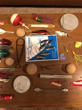 Lot of vintage fishing items. Great for display in cabin or man cave! Bobbers, lures, spoons, stringer, leader tins, boat lights, fish scalers, hook removal tools, etc… Cabin, fishing, man cave, bar, tackle, river, lake, stream