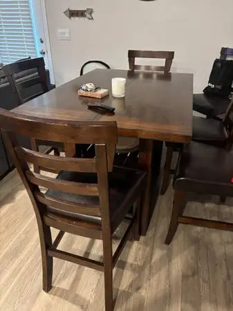 Expandable dining room table, sits 4 when at its base size or up to 8 when leaf is placed to expand. Measurements are 35.5x53 when seating 4 and 53x53 when leaf is placed. Has a small hidden cubby in the middle for storage and 2 shelves underneath. The chairs are wood with leather cushion. It has been well used, but bought brand new by our parents, so we have been the only owners. There are a few dings and scratches, but was bought brand new for over $2000. Asking for $650 OBO. CANNOT drop off, must pick up (I am pregnant and cannot help with loading or unloading.) The table is very sturdy wood, and great quality. We are trying to downsize due to the small nature of our home and adding a new bedroom for the nursery.