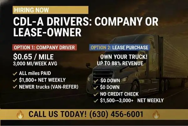 CDL-A: COMPANY $0.65/MI | LEASE $0 DOWN $599$929/WK • OTR & Regional • 70 Truck Modern Fleet Glenwood-based carrier with top-of-the-line new equipment has IMMEDIATE OPENINGS for professional CDL-A semi-truck drivers! Tired of unreliable gigs? Join a company that puts YOU first with steady fr 8, modern semis, and real paths to success. We’re a growing fleet of 70 trucks, specializing in OTR and regional hauls—no straight trucks, just premium semi opportunities. 2 PATHS — PICK YOUR WIN: OPTION 1: COMPANY DRIVERStability Path Top-Tier Pay: Starting at $0.65/mi — ALL MILES PAIDloaded & empty. Consistent Miles: Avg 3,000 mi/week 2,7003,100 guaranteed. Earnings: Avg $1,800 per week$1,755$2,015 based on miles. Home Time: 23 weeks out, then quality reset at home. Equipment: 20222026 Kenworth / Fr 8 liner / International with fridge + inverter. OPTION 2: OWNER OP / LEASE PURCHASEOwnership Path Revenue Split: Keep up to 88 of the load. Take-Home: Avg $1,500$3,000 per week. Lease Rates: $599$929/week 2022 to brand-new trucks. $0 Down • No Credit Check: Clean driving record gets you rolling. True Ownership: Lease-to-own, walk-away options, no balloon payment. Freedom: No forced dispatch — you choose loads & routes. BENEFITS FOR ALL DRIVERS ✓ New, reliable trucks 20222026 with comfort + safety features ✓ Steady, year-round fr 8 keep wheels turning, keep earning ✓ 24/7 dispatch & supportbreakdowns, routing, questions ✓ 100 no-touch fr 8 focus on driving, not loading ✓ Respectful, professional culture + safety bonuses + growth QUALIFICATIONS • Valid CDL Class A • 2 years verifiable OTR semi-truck experience • Clean MVR & safety record Spots are filling fast. Get priority on the best routes & trucks by applying now. Your Next Career Move Is 1 Call Away — CALL TODAY: • OTR & Regional • Company or Lease-To-Own