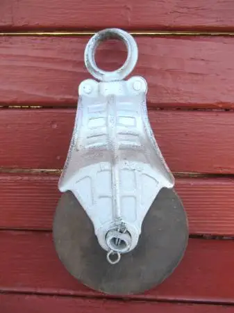 Up for sale is a vintage Meyers Barn Pulley. This has a steel cage and wood pulley. The painted silver steel cage has a great design with multiple raised ribs in the casting. The pulley has a large round area at the top. This design allowed a knotted rope to be used. The sides of the steel cage are alternately numbered H235 and H236. These numbers allow the pulley brand to be identified as Meyers. The wooden pulley wheel is about 5 ¾” diameter x 1 ¾” wide. The complete pulley measures about 11” tall to the top of the swivel ring. x 6-1/4” wide x 4” deep. Pulley body is designed to allow a knotted rope to pass over the pulley wheel. Nice primitive country, farm décor or it could still be used. This can be picked-up in Kickapoo. No checks please. Click on the contact button for the phone number and call after 7:00 am. No calls after 4:30 pm. Use the More ads by this user to see my additional ads. Dependable Peoria Craigslist seller since January 07, 2009.