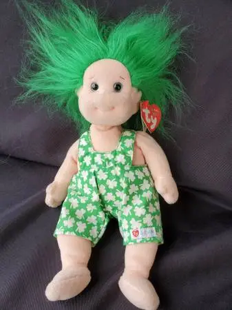 2000 Retired Ty Beanie Babies Kids SHENANIGAN Boy Doll Toy Green hair, blue eyes Wearing original outfit it came with. Removable Green overalls with white shamrocks Official Ty Gear outfit Comb his hair or make it wild! Fun for St. Patrick’s day too Do you remember TY Beanie Babies? These we also made by TY, called Beanie Kids They came with a removable outfit called TY Gear Plush doll is 10 inches tall Collectible children’s toy Stored for decades in an airtight container for decades Nonsmoking no pet household $10