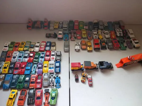 Selling a collection of 100 die-cast cars, a mix of Hot Wheels, Matchbox, and a few other brands. These have all been played with—no mint-condition pieces—but there are several notable models included. • Hot Wheels Flat Out 4421978, Hong Kong– yellow version • Hot Wheels Sharkruiser 1988 • Tide brand semi-truck + trailer, includes the matching small Tide race car that stores inside Most cars show wear from play: paint chips, scuffs, etc. Selling as a full lot, but willing to separate out individual cars or small groups for serious buyers. Great for collectors, resellers, or any 1 building a bulk lot. Price negotiable depending on if you want the whole set or specific pieces. Chat, email, text, call. However you communicate. 986-986-6036