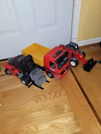 1. Bruder dump truck-$25 2. Crane truck-$15 3. Bruder forklift with containers -$30 4. Bruder front loader -$30 Will sell all for $75