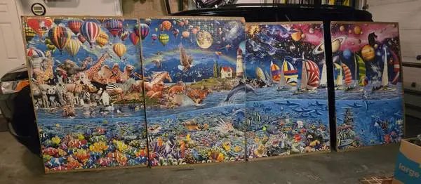 This is a giant jig saw puzzle, already put together, glued to cardboard back pieces. Each piece is 64 H x 43 W, so this giant puzzle is 132 inches wide, enough to fill an entire wall. It comes from a smoke free home, the price is $30. Pick up in SW Sioux Falls with cash, Venmo, or PayPal. Call or text at 605-360-3831. 105