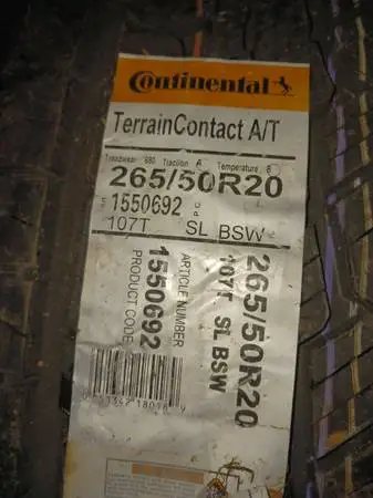265/50R20 Continental Terrain Contact A/T 1 tire never used, like new still has sticker, a few years old $140 Cost $282 new Please call or text.