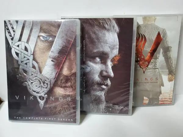 The product is a DVD set of the TV series Vikings, including seasons 1-3. The set contains 9 DVDs and is in excellent condition. The show is an action-packed historical adventure set in the Viking Age, featuring actors Travis Fimmel and Gabriel Byrne. The DVDs are in English with subtitles and are formatted in widescreen. The set is compatible with DVD region code 1 (US, Canada...) and is produced by the History channel.