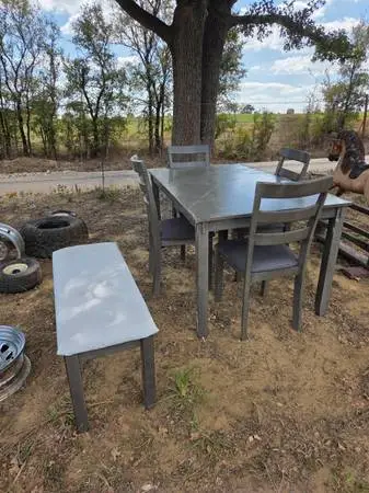 I am selling my kitchen table and 4 chairs and a bench asking 100 no trades or pay pal call or text me at 817-896-2481.