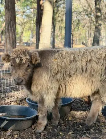 Mini Highland Bull Calf Dun colored Calm and easy to work around Not halter started yet, but should be easy Loves his grain Intact Not registered Very cute boy Located in Midlothian, TX 76065 Possible delivery Beautiful Moments Farm PM @beautifulmomentsfarm on Facebook or Instagram for any questions, or call/text 214-960-8032.
