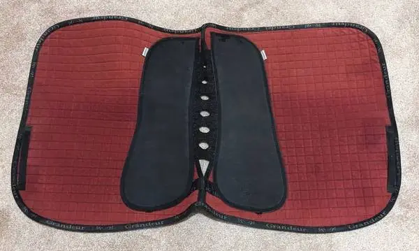 Nonslip saddle pad with a wither contour, made by Grandeur. Red quilted with black trim. The neoprene prevents the saddle from slipping back off the withers. The underside is compressed wool, a natural fiber known for its ability to wick sweat away. Measures 20 inches deep by 24 inches long. Made in Germany. Durable, comfortable, high-quality material, long-lasting. Machine washable, air dry. Designed and cut to stay in place. The Grandeur Airco Quilt Saddle Square design features include: โข Vented Spine: The spine is specifically cut and designed with vents to allow air flow, which helps reduce heat buildup in a critical area where horses sweat the most. โข Material: The underside is a highly breathable compressed wool, a natural fiber known for its ability to wick sweat away and dissipate heat. If you are reading this ad, then the saddle pad is still for sale. Please send a local name and PHONE NUMBER and I will text you. Thank you.