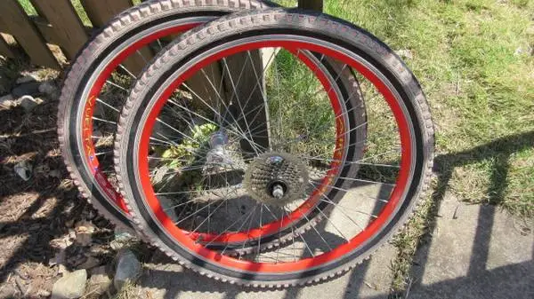 Great condition 26in alloy airline rims for MTB mountain bike hybrid. The special airline profile is for greater strength Current mounted 26x1.90 tires shown in ad picture for show will be removed. Can include if needed (The tires are done but the inner tube fully hold air as shown) The rear 7 speed cogs are shimano compatible (Falcon) with a wider range for speed, yet lots of low gear range) Contact with a fair price offer to purchase