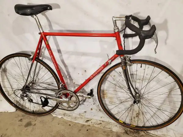 ITALIAN DE BERNARDI COLUMBUS STEEL LUGGED ROAD BIKE 60CM Beautiful, solid, chromed steel lugged Italian frameset. High-quality Columbus steel frame and fork made in Italian Frame size is 59cm (23.5 inches) which is suited for a tall rider 58”- 63” tall (unfortunately this bike is too tall for me) Frame is red in color Campagnolo front and rear derailers Campagnolo front and rear brake calibers and levers Upgraded Campagnolo index (chick which you change each gear) shifters on the down tube 700c wheels with tubular tires which hold air Collectors and professional bikers seek and value these bikes so now is your chance to buy one of the best steel Italian bikes ever made. Asking only $700 I’ve seen just the frame no components or wheels go for $600 on eBay More information Tubulars are completely round. The tube is basically sewn into the tire and is part of it. As a result, the tubular is just one piece. Tubular tires are often glued to the rim, because without some glue they tend to move around a bit. Tubulars are less common, but have a strong following with many road and triathlon cyclists. The total weight of a tubular rim and tire is always lighter than its clincher equivalent. Other advantages of this system include a decreased chance of pinch flats, an ability to operate with a wider range of tire pressures (from 25 to 200 psi), and increased safety in the event of a flat at high speed because a properly glued on tubular tire is less likely to roll off the rim. Most pros use tubular tires as from a performance point of view. A tubular isn’t constrained by the rim sidewalls, so it can flex more. This means that a 25 mm tubular gives you the shock absorption of a 28 mm clincher – useful when you’re descending bumpy mountain passes at speed. A De Bernardi frame might be the best bike you never heard of. In the heyday of steel frames, back in the 60s, 70s, and 80s, the De Bernardis owned a shop in Cuneo, Italy, called Technotrat. Not wanting to be involved with the complexities of marking and distribution, their specialty was building high-quality frames for other brands, such as Saronni. But the De Bernardis did build a few under their own name.