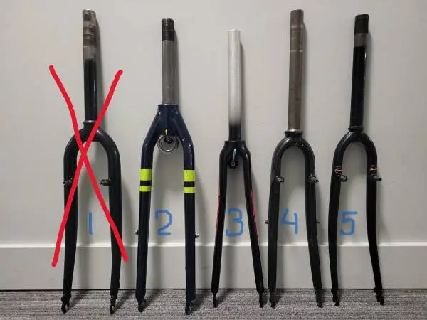 x4 fourches rigides en chromoly et acier pour vélos hybride ou route (roues de 700c/622c), veuillez lire la description suivante pour plus de détails.: #2. Vient dun TREK (la tige filetée), chromoly, compatible avec les deux - freins à disque et en U. La longueur du tube de direction (steerer tube) 7.25po, la largeur du tube 28.5mm. La tige est filetée, mais si nécessaire, je pourrais vous donner une étoile pour une configuration régulière. Pré-réglé pour installation de porte-vélos LowRider et garde-boue. Bon état. $85; #3. Vient dun DIADORA de route, chromoly, compatible uniquement avec freins à U. La longueur du tube de direction (steerer tube) 9.75po, la largeur du tube 28.5-30.0mm. Bon état. 70$; #4. Provient dun hybride NORCO, en acier, freins «V» uniquement. Longueur du tube de direction 10 pouces, largeur du tube 28.5 mm. Préréglé pour linstallation de porte-vélos LowRider et de garde-boue. Mis à part quelques égratignures de peinture, bon état. 50$; #5. Provient dun hybride EVO, en acier, freins «V» uniquement. Longueur du tube de direction 9.5 pouces, largeur du tube 28.5 mm. La tige est filetée, mais est livrée avec un star nut pour une configuration standard. 50$. x4 rigid forks made of chromoly and steel for a hybrid or a road bike (wheels 700c/622c): #2. Comes from a TREK (the threaded tube), chromoly, compatible with both - disc and U brakes. Length of the steerer tube 7.25in, the width of the tube 28.5mm. The stem is threaded, but if needed I could give you a star for a regular setup. Pre-set for installation of LowRider bike racks and mudguards. Good condition. $85; #3. Comes from a DIADORA road, chromoly, compatible with U brakes only. Length of the steerer tube 9.75in, the width of the tube 28.5-30.0mm. Good condition. $70; #4. Comes from a NORCO hybrid, steel, V brakes only. Length of the steerer tube 10in, the width of the tube 28.5mm. Pre-set for installation of LowRider bike racks and mudguards. Aside from some paint chaps, good condition. $50; #5. Comes from a EVO hybrid, steel, V brakes only. Length of the steerer tube 9.5in, the width of the tube 28.5mm. The stem is threaded, but comes with a star nut for a regular setup. $50.