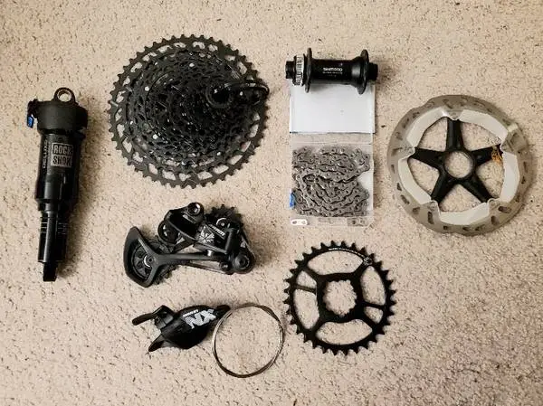 Got a new bike; have some extra parts. All new-unused except #7. 1. Shock-- Rockshox Deluxe Select+ RT 210x55mm-- simple and straightforward inline shock- 11 clicks rebound, pressure, and 2-position compression lever-- firm and open. Details: Product code: RS-DLX-SELP-C1. Progressive air spring, digressive rebound tune, L1 compression tune, lockout force 380. Volume tokens installed: 0 neg, 3 pos. Check tune 0-light. E-bike approved. $350; 2. SRAM 12s cassette--Eagle NX PG-1230 11-50-- $135; 3. SRAM 12s derailleur-- NX Eagle Long Cage-- $150 4. SRAM 12s shifter-- NX Eagle-- $50 5. SRAM 12s chain-- Eagle-- 117 s + quick-- $25. 6. SRAM 12s chainring-- Eagle X-sync2 32T-- $22 7. Shimano Freeza Rotor-- Centrelock 180mm lightly used (only 0.05mm wear)-- $60 8. Maxxis Minion DHR-II 27.5--2.4WT Max Terra EXO+ $80