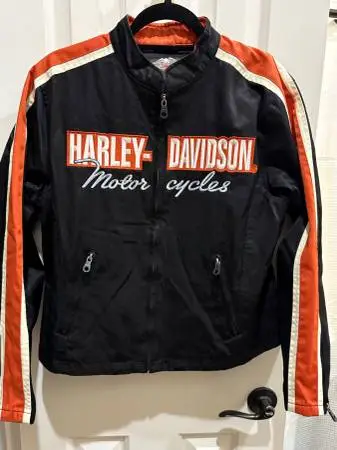 **PLEASE READ** DUE TO INCREASED SPAM I WILL “NOT” RESPOND TO TEXTS OR EMAILS! PHONE CALLS ONLY! IF YOU ARE INTERESTED IN THE ITEM PLEASE CALL. IF YOU SEE THE LISTING THEN THE ITEM IS STILL AVAILABLE Womens Genuine Harley-Davidson Embroidered Logo Racing Jacket - Black and Orange Part # 98148-03VW Size Large Excellent like new condition - Clean - No fading Embroidered lettering on front 2 zip hand pockets 2 inside pockets (1 snap and 1 zip) Long sleeve with zipper cuffs Zipper closure All zipper pulls intact 59% Cotton, 41% Nylon Approx measurements lying flat: Length - 21 Arm Pit to Arm Pit - 23