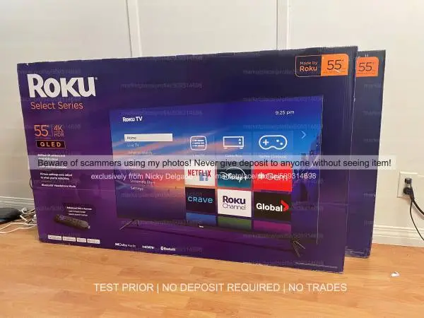 Selling several open box in new and like new condition state Roku 55 Select Series 4K Smart TV (model 55R5C5CA) 2025/26 model. Used for staging so barely used, no scratches, dead pixels, or issues. Works perfectly! **YOU CAN TEST/ INSPECT IT PRIOR TO PURCHASE** NO DEPOSIT REQUIRED!!**NO TRADES $335 FIRM = NON NEGOTIABLE Highlighhts: * Brilliant 4K UHD resolution with HDR10 and QLED for vibrant colors, deep blacks, and amazing brightness * Perfect for movies, sports, gaming, and streaming. * Built-in Roku Smart TV platform: Easy access to Netflix, Prime Video, Disney+, Apple TV, YouTube, and 500+ free live channels. * Enhanced Voice Remote with shortcuts, private listening (headphones via app), and lost remote finder. * Compatible with Alexa, Google Assistant, and Apple HomeKit. * Automatic brightness adjustment, clear Dolby Audio sound, and low-input lag for gaming. Whats Included: TV, Original Enhanced Voice Remote, Power cord, Stand/legs and OEM Box. Delivery is available for a fee depends on your area. Pick up only near the PNE Grounds Area in Vancouver, BC, at our office. By appointment only.