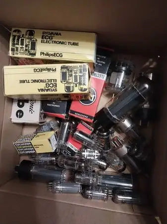 32 different tubes. Amperex, Hallicrafters, RCA, Tungsol, GE, DeVry Tech, Raytheon, Magnavox. 1-6907, 1-6DQ5, 8-5U4GB, 2-2E26, 3-12BY7A, 8-6GH8A, 5-6CL6, 1-6AN8A, 3-6AW8A. All 32 for $60.00.