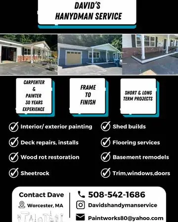 A couple hours or a couple weeks No job to big or to small !!! Key words.. 30 years of carpentry and painting experience. All rot repairs interior and exterior Complete exterior paint jobs Deck staining and painting Frame to finish!! Interior and exterior painting! Epoxy floors . Deck repairs ,exterior trim repairs , and installs. Brand new builds . Sheds Sheetrock repairs . Flooring installs and repairs windows doors Basement remodels, custom on site ceder fences built ! Call Dave @ 508-542-1686