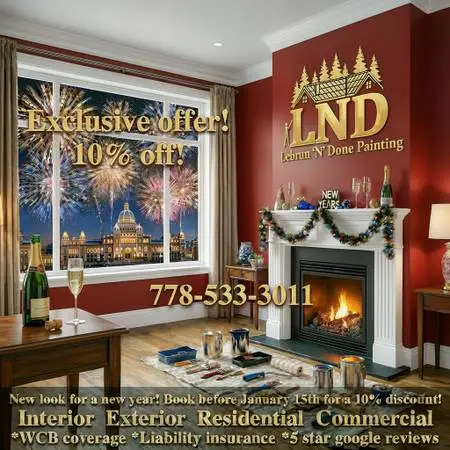 New Year, New View: Start 2026 with a Fresh Coat! New Year’s Exclusive Offer! Save 10 on all projects booked by January 1 st, 2026 🥂 Are you heading into the New Year tired of the same old run-around from big, overpriced painting companies who treat you like a number? Or are you worried about the budget DIYers who lack insurance, work ethic, and attention to detail? Make a resolution to get the quality you deserve. Choose Lebrun N D 1 Painting for a personalized, professional experience that starts your 2026 off right. Why Choose Lebrun N D 1 Professional & Protected: Fully WorkSafe covered and liability insured for your peace of mind. Versatile Expertise: Specializing in interior new construction, renovations, and stunning exterior transformations. Dont let your home renovation resolutions gather dust. Let’s make your space look brand new for the New Year! Give us a call, text, or email today and let’s get started ASAP! 778-533-3011 Lndpainting@hotmail.com