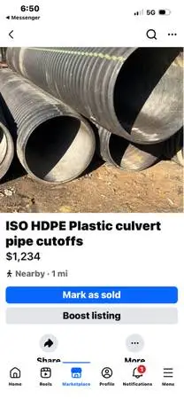 Looking for plastic culvert pipe cutoffs 18 inch to 24 inch diameter 2 foot long 8 foot at least total.