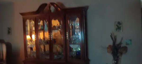 Thomasville cherry maghony china cabinet 7 ft tall, wide 5 feet, 2 glass shelves, lights up to display. Excellent condition.