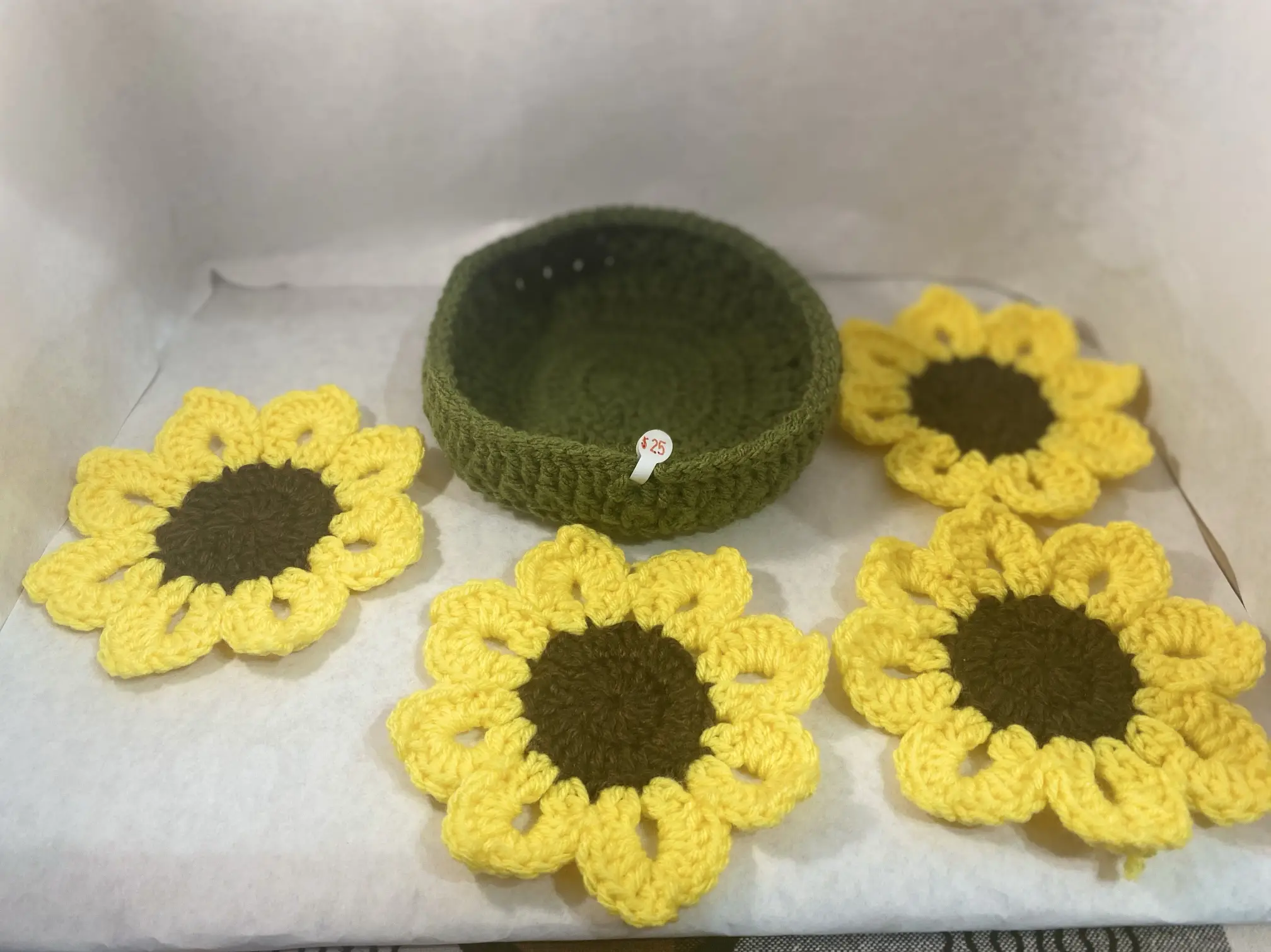 Handmade with love, Sunflower coasters with basket. Great for gifting or decor. Includes 4 coasters and a basket. Price of $25 is for 4 coasters and a basket. Quantity of 2 available.