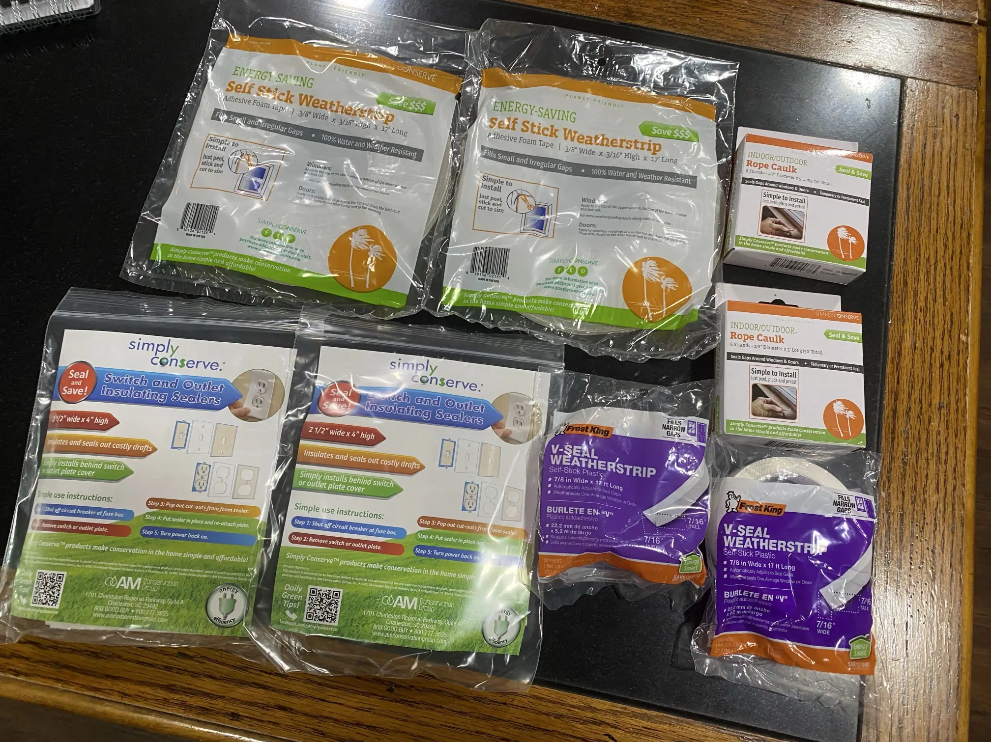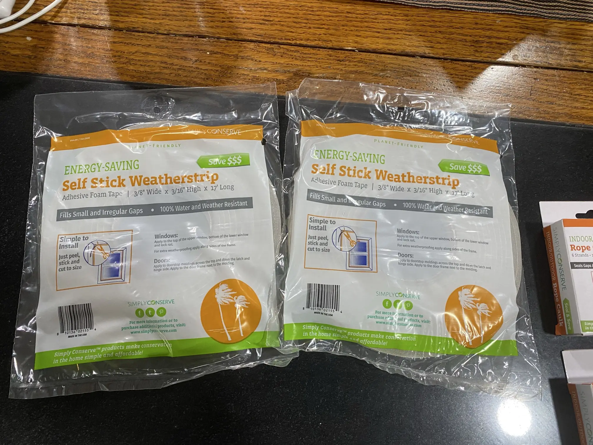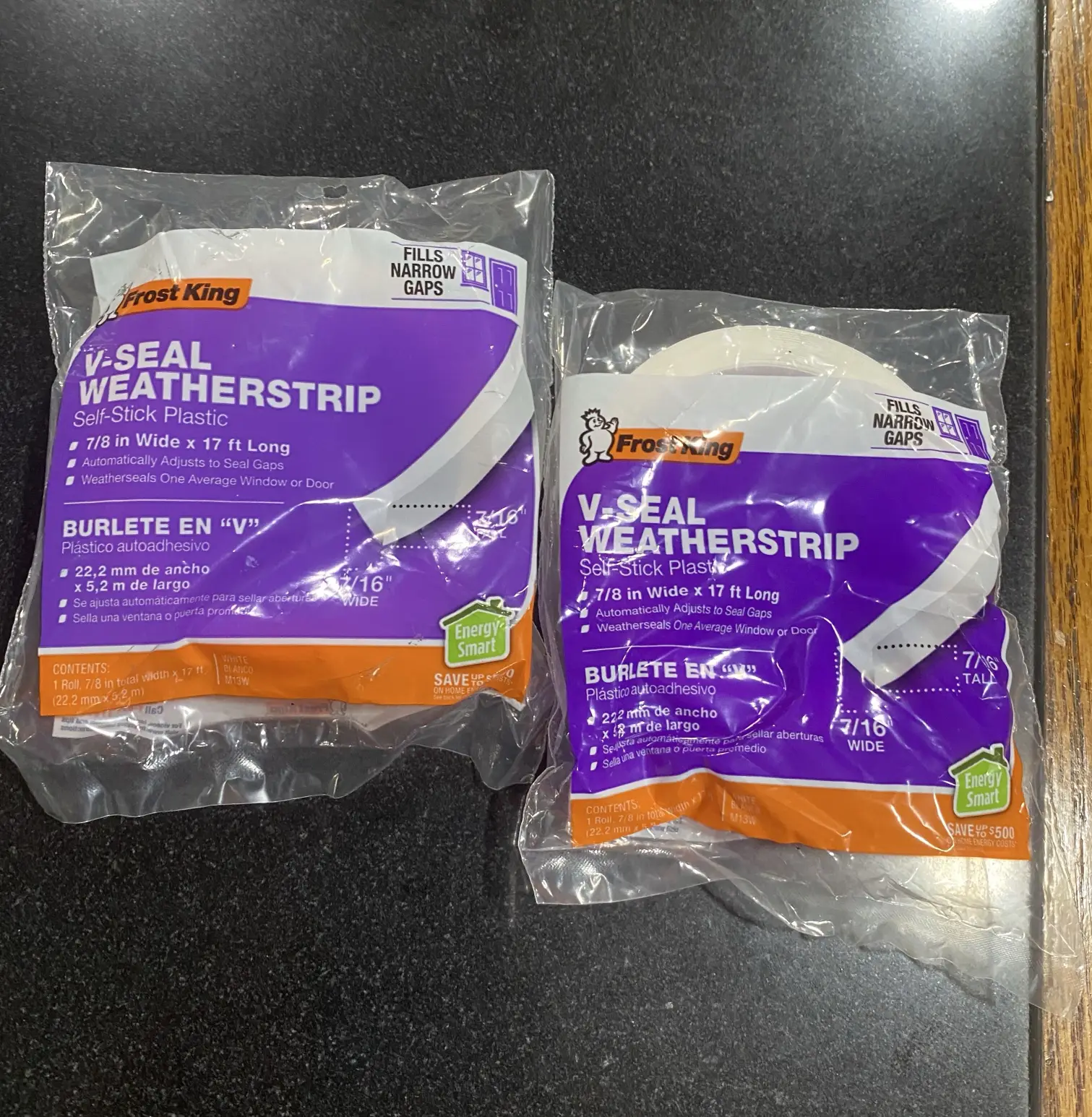 Brand new, includes: (2) 17”rolls of closed cell foam tape weatherstripping (2) 17” rolls of V-seal type weatherstripping (2) rolls of 30” rope caulk (2) packs of outlet and switch foam draft sealers